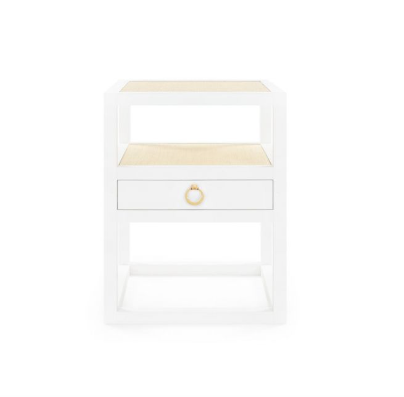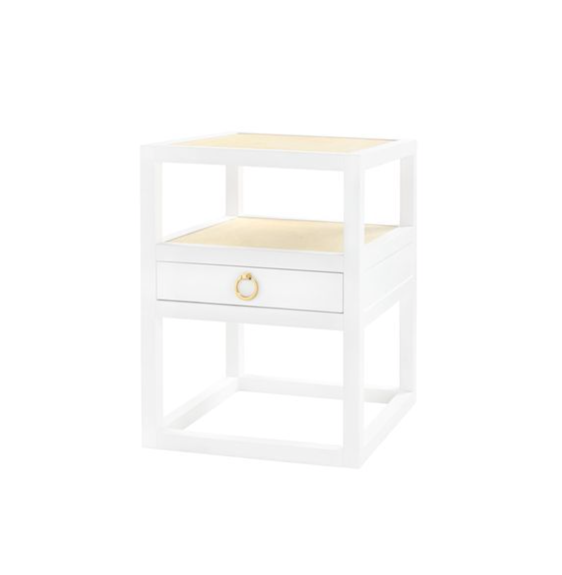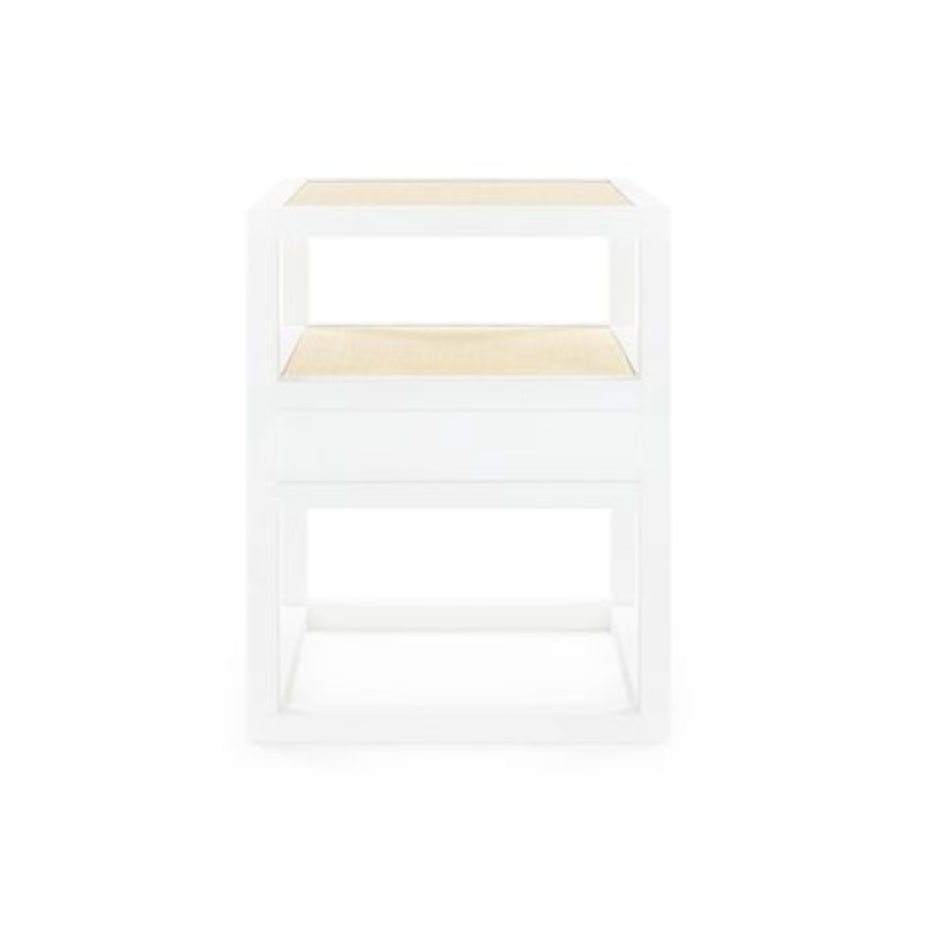 The Polo Side Table artfully combines two classic textures: grasscloth and lacquer. Pine drawer interiors keep the design details bright and airy throughout, while the bronze finish pull gives the piece a solid focal point.