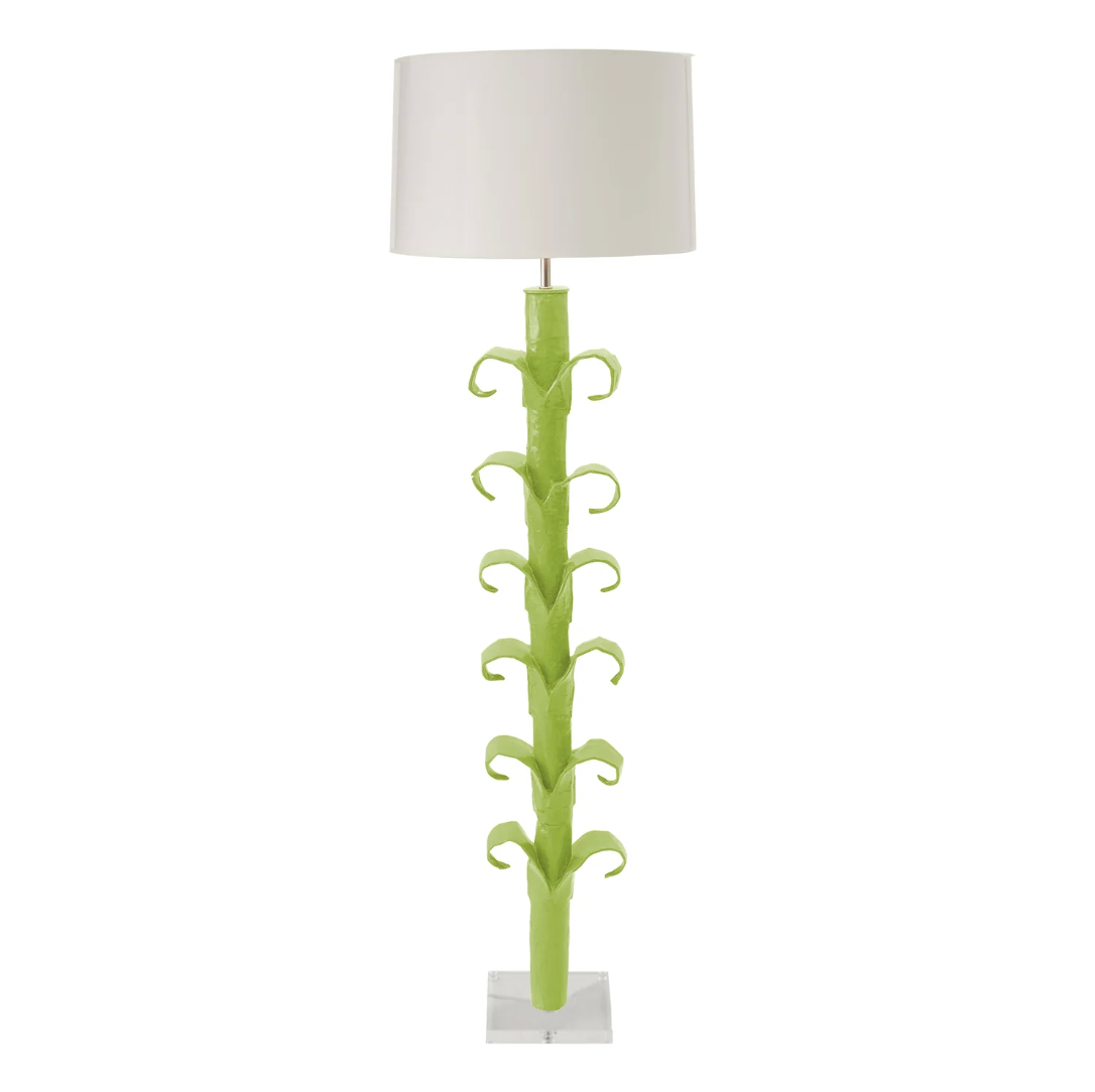The Aly Floor Lamp is quite dashing! Her stacked leafy lushness will enliven any space.The papier mache body is hand built, layered and sculpted on metal tubing then finished with two coats of a non-toxic paint and a water based poly. Comes with a mouth blown recycled glass final, a painted paper shade and an acrylic foot.