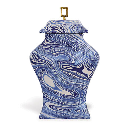 The Arctic Jar features a blue and white porcelain design inspired by blue malachite. Its narrow, 5" deep shape fits perfectly on your mantle, alone or in pairs, and shines with solid brass bamboo hardware. A playful touch for your space!