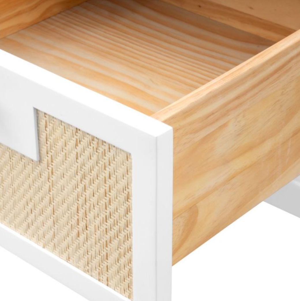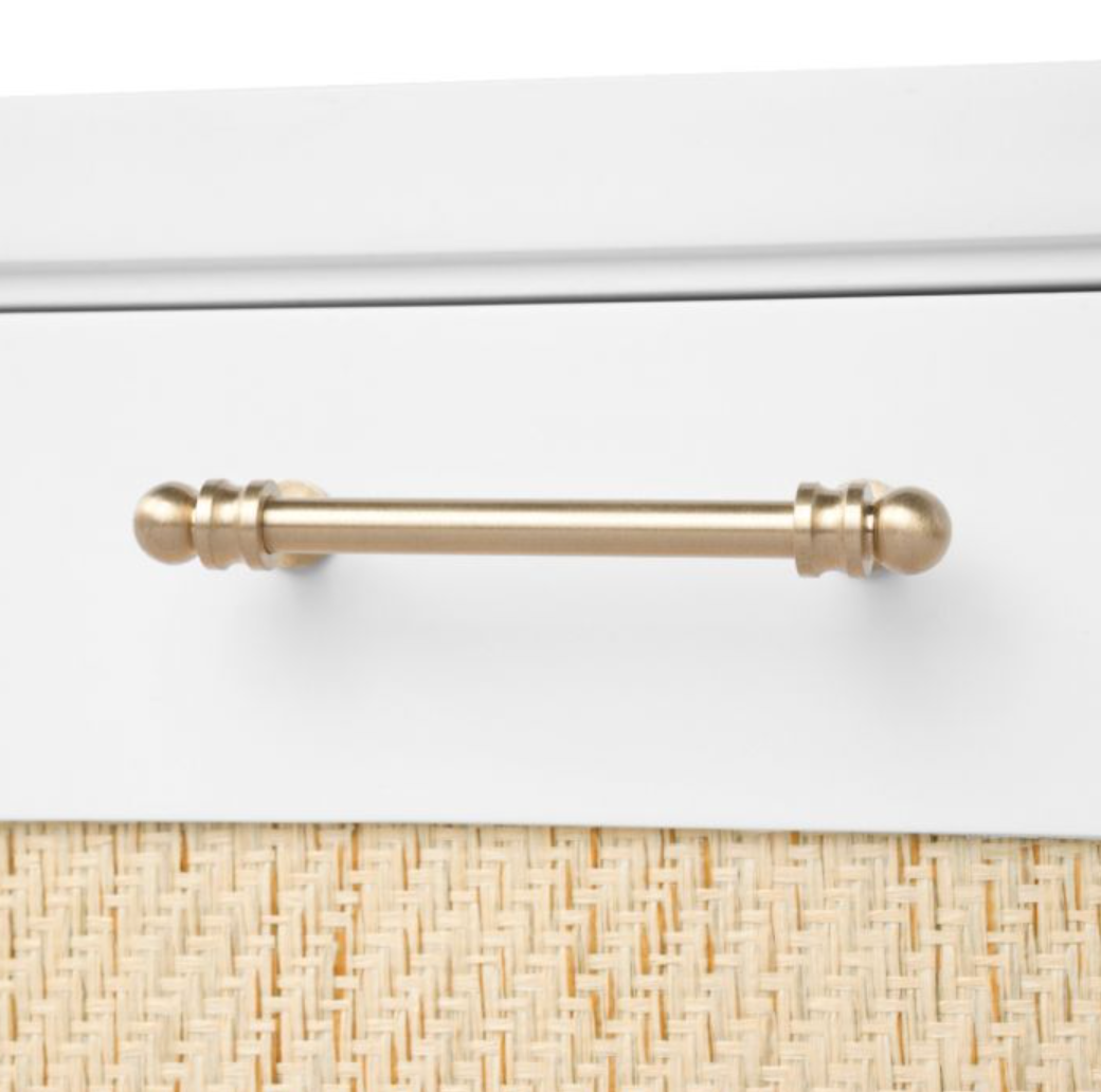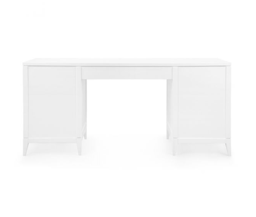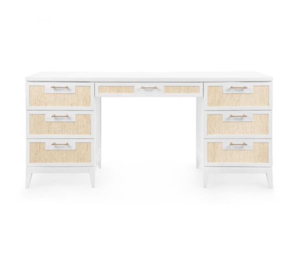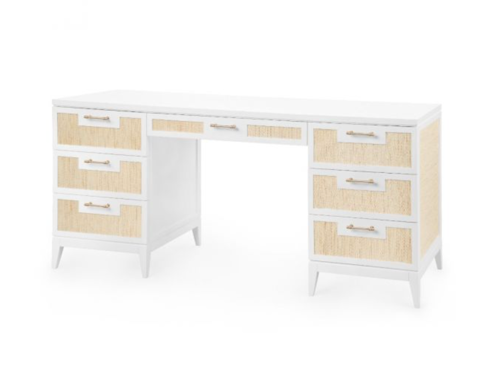 The Astor Desk, available in white lacquer, features panels of finely-woven grasscloth, which add a natural element. Its seven soft-closing drawers of veneered wood boast custom brushed brass pulls as the perfect finishing touch, securing its status as a chic and sumptuous piece of work.