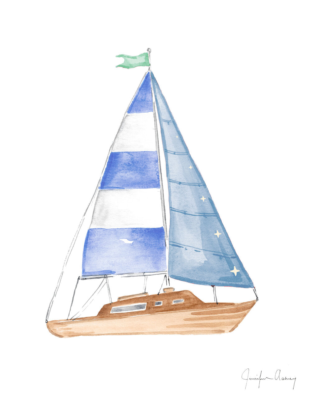 Sail into this Jennifer Ashley Blue Sailboat Print! Perfect in a boy's room or at the beach! Available as a print only or framed. Add the red and blue sailboat print to make a pair!