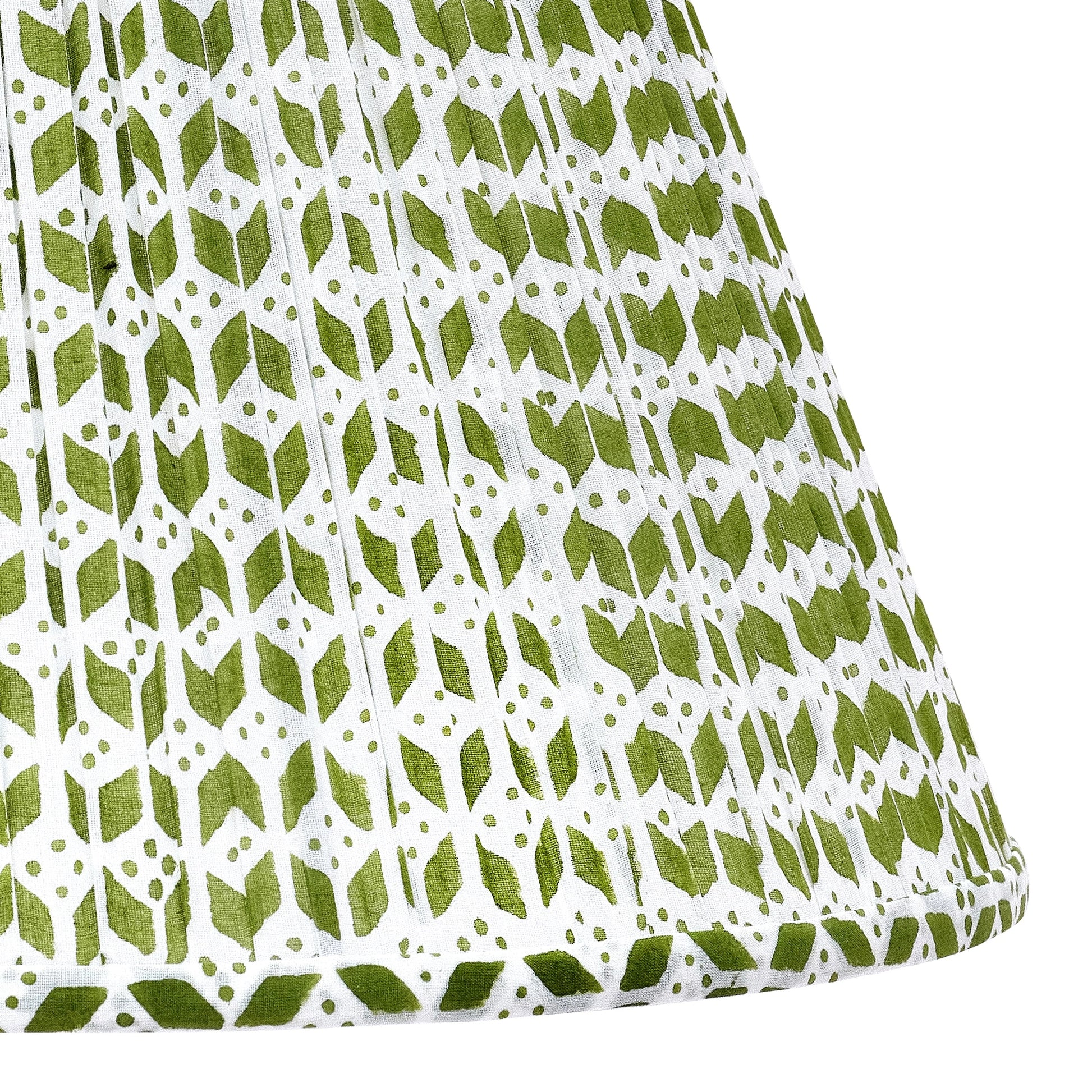 Crafted from hand block printed fabric, this lampshade has a geometric print in a verdant green.