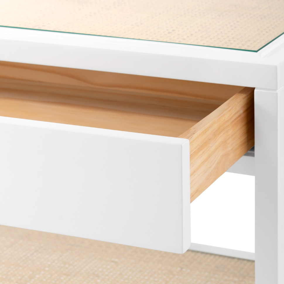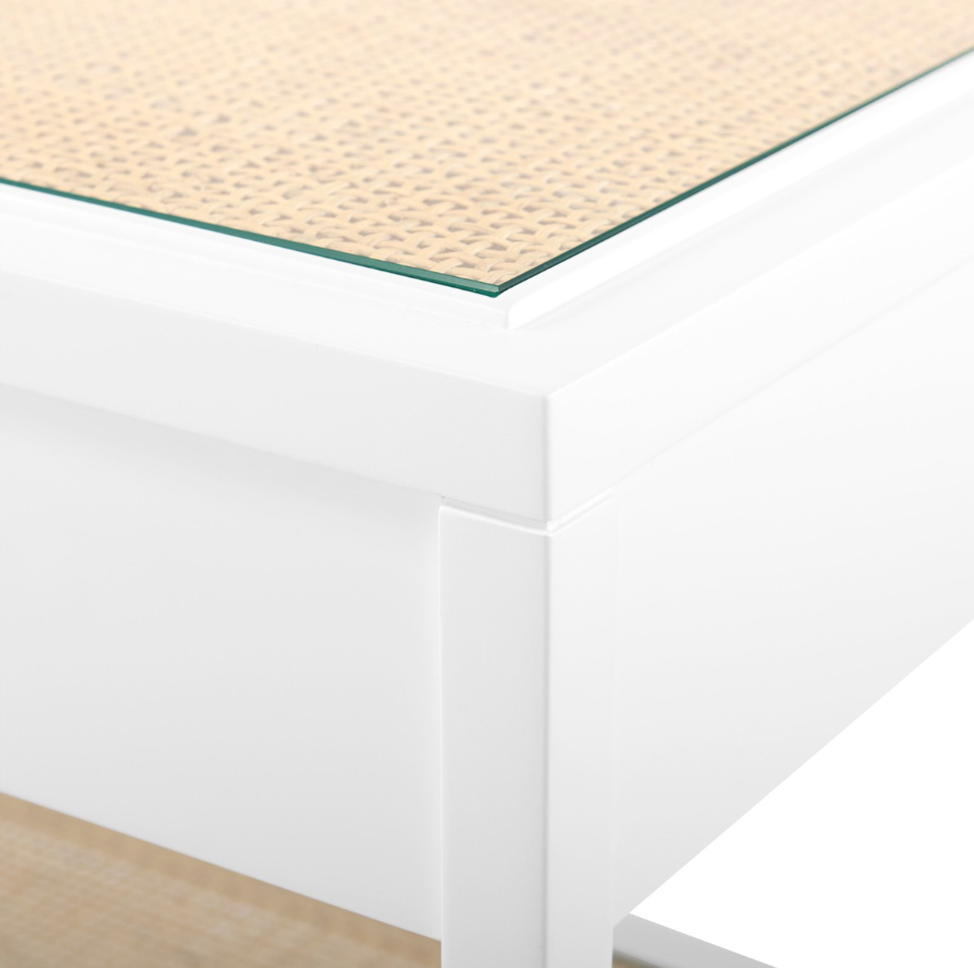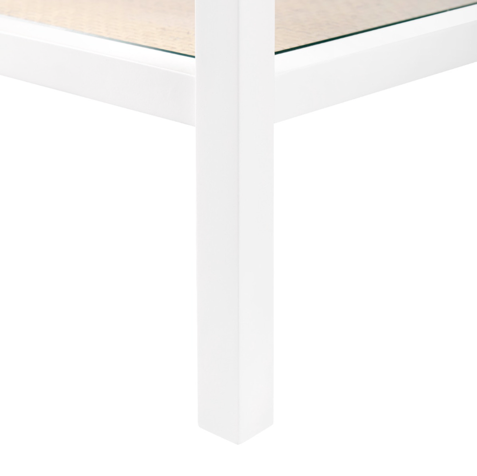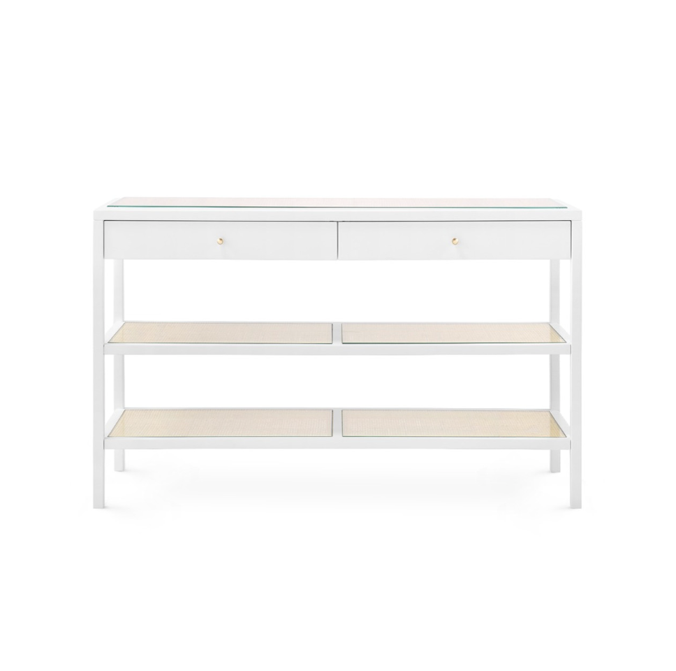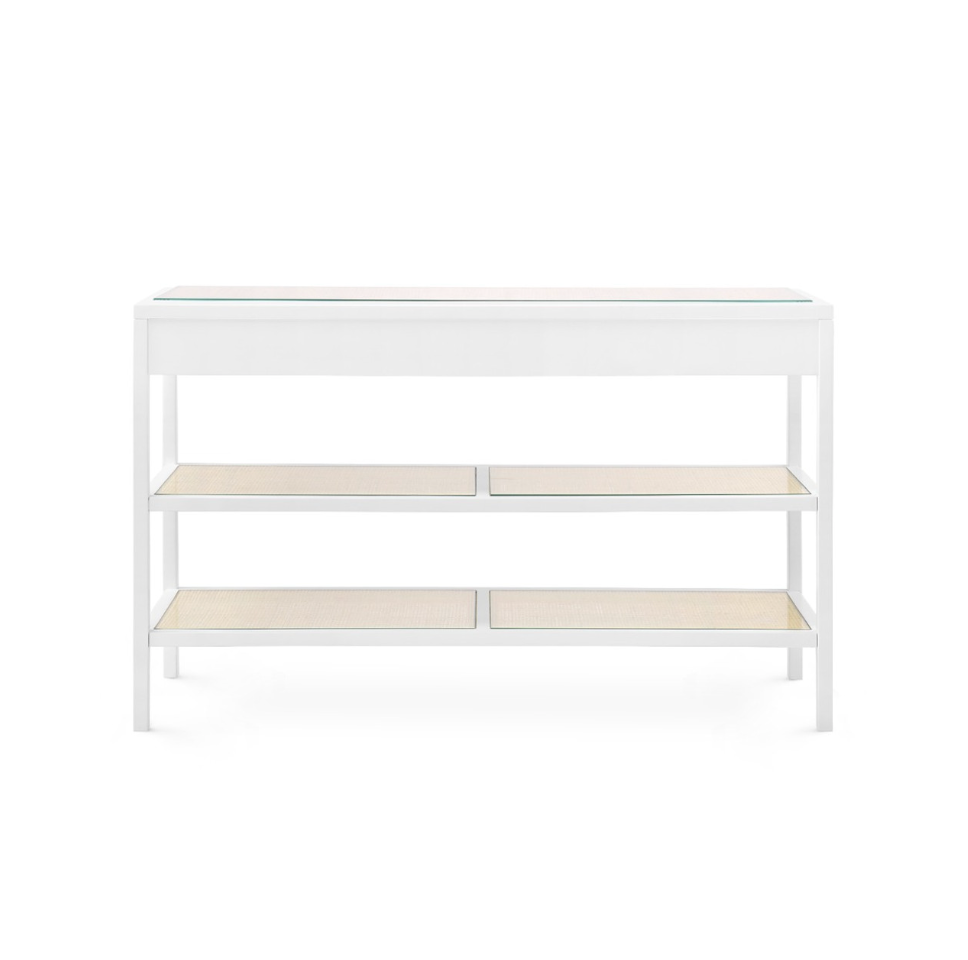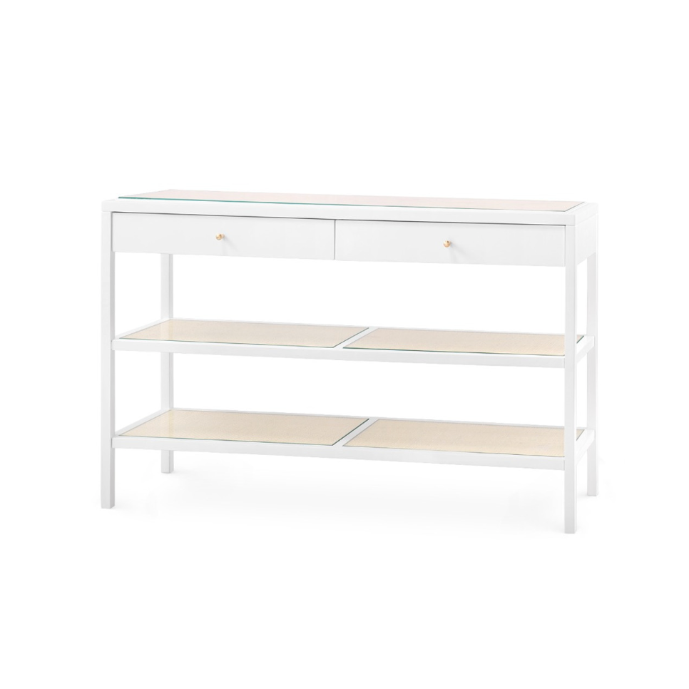 Made by combining lacquered wood with the relaxed touch of cane, the collection is light, airy, and endlessly adaptable. Each of its three shelves is made of woven cane, and is topped with a durable piece of glass. The two top drawers boast polished brass pulls for extra flair. It's perfect for stacking books, storing necessities, or showing off decorative statues.