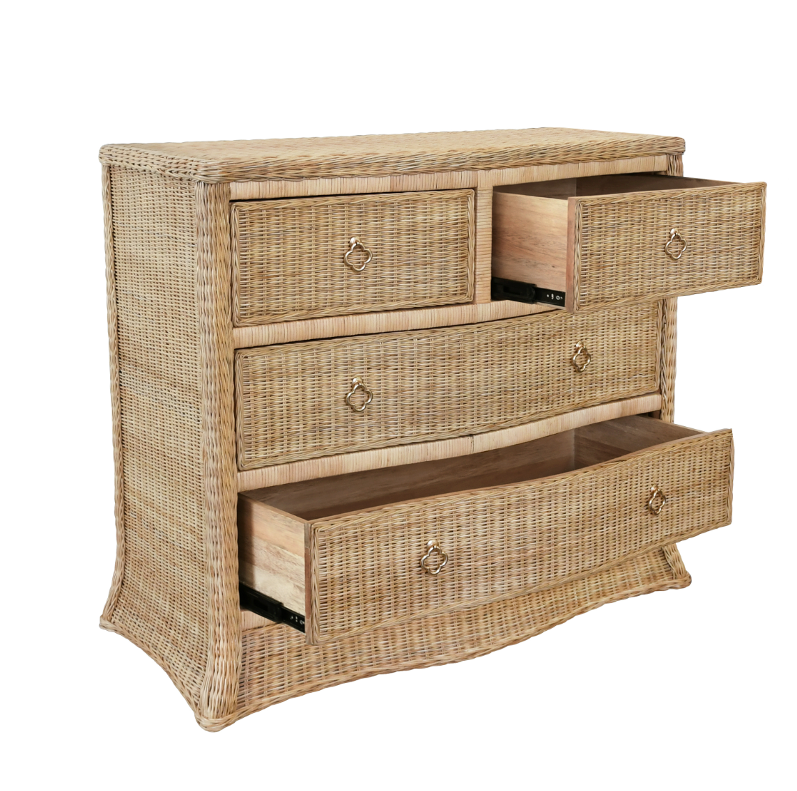 - Four drawer chest in woven rattan with satin brass pulls and soft close glides