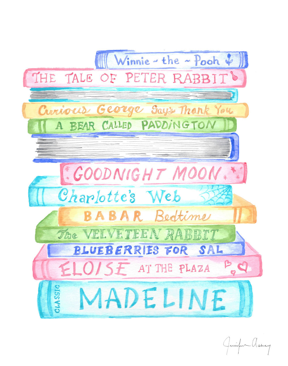 A watercolor print of all of the classic children's books to brighten the nursery.