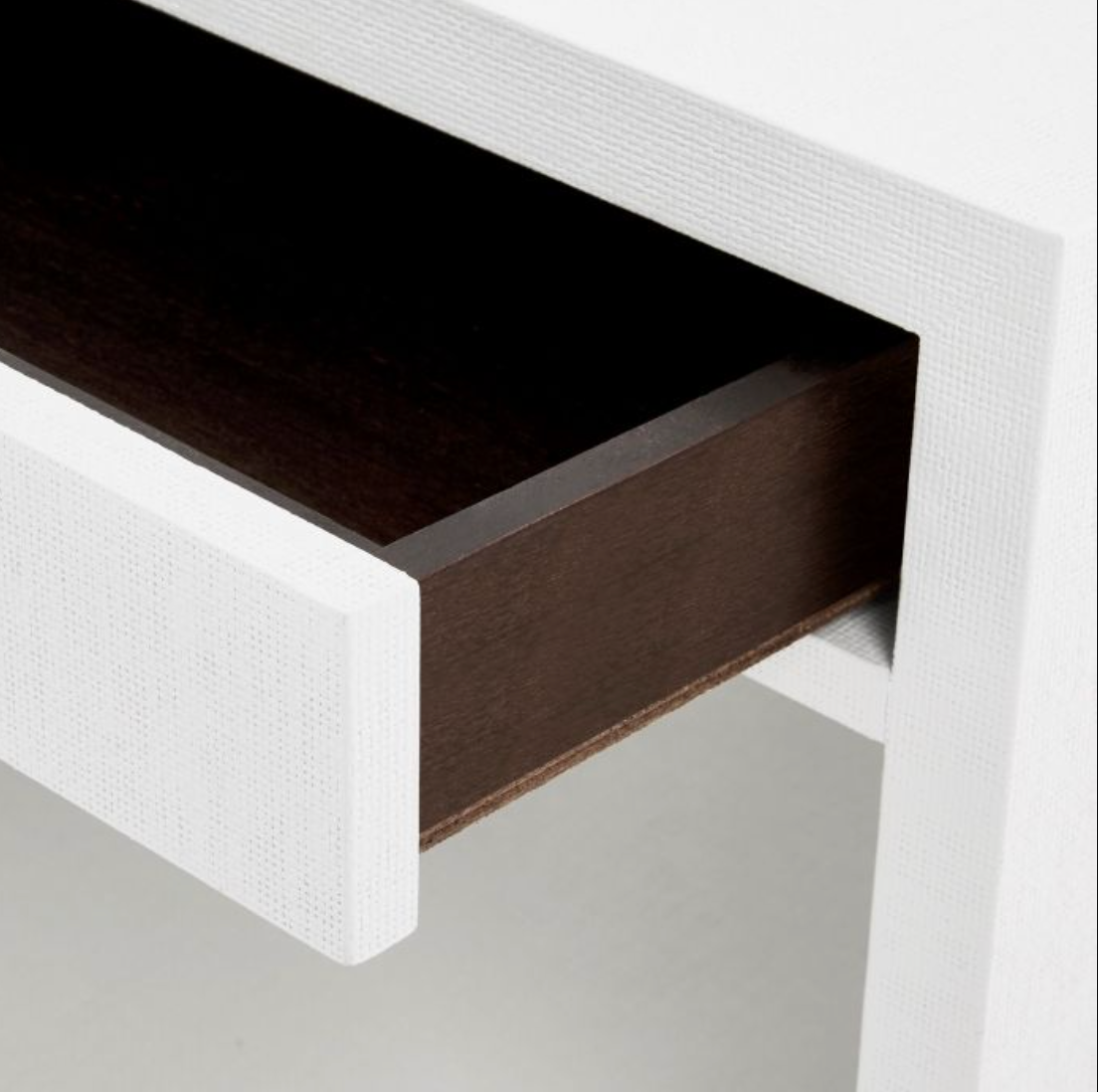 This classic design mixes beautiful proportion with details like graduated drawer heights, pretty reveals and unexpected hardware. The rectilinear design is grounded by tactile grasscloth in sober colors.