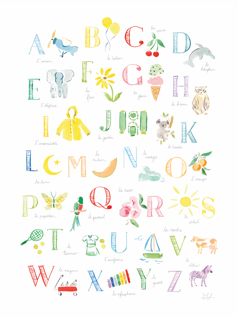 Gina Langford's alphabet print is trés magnifique using French words with her darling watercolor illustrations. Framed and ready for your bébé!