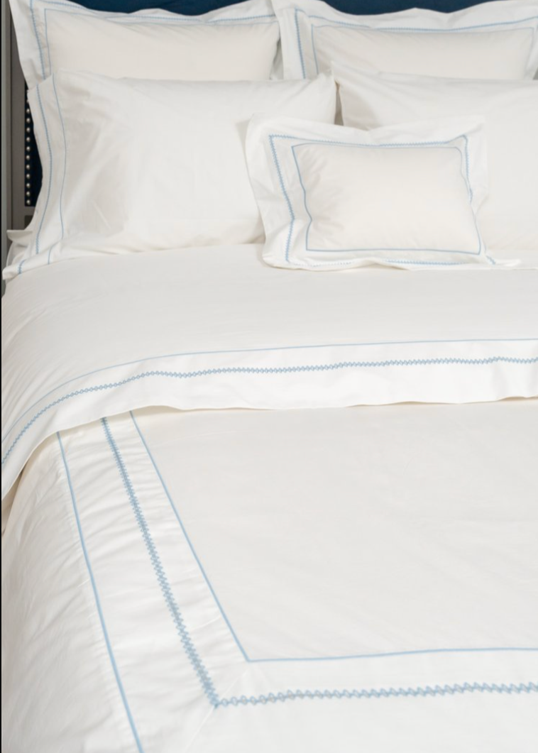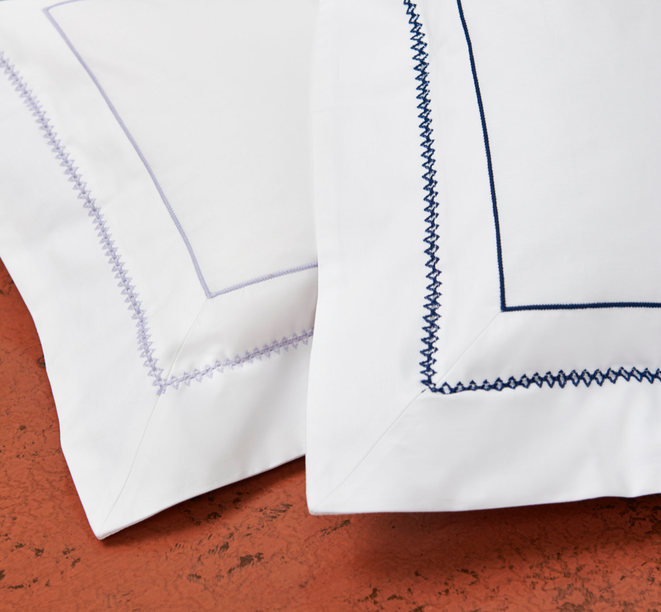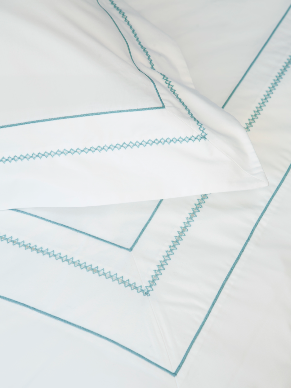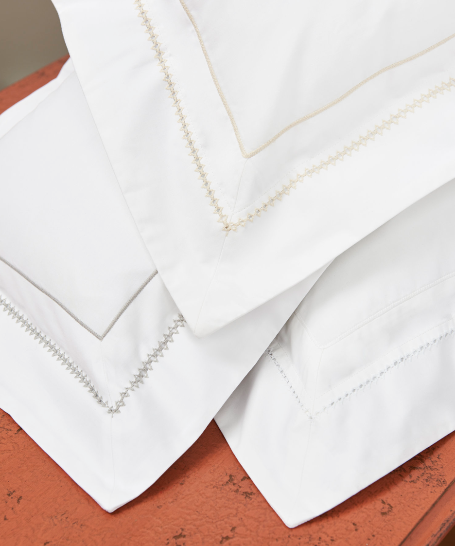 A unique embroidery resembling a delicate crochet stitch on white percale on sheets, pillowcases, duvets and shams.