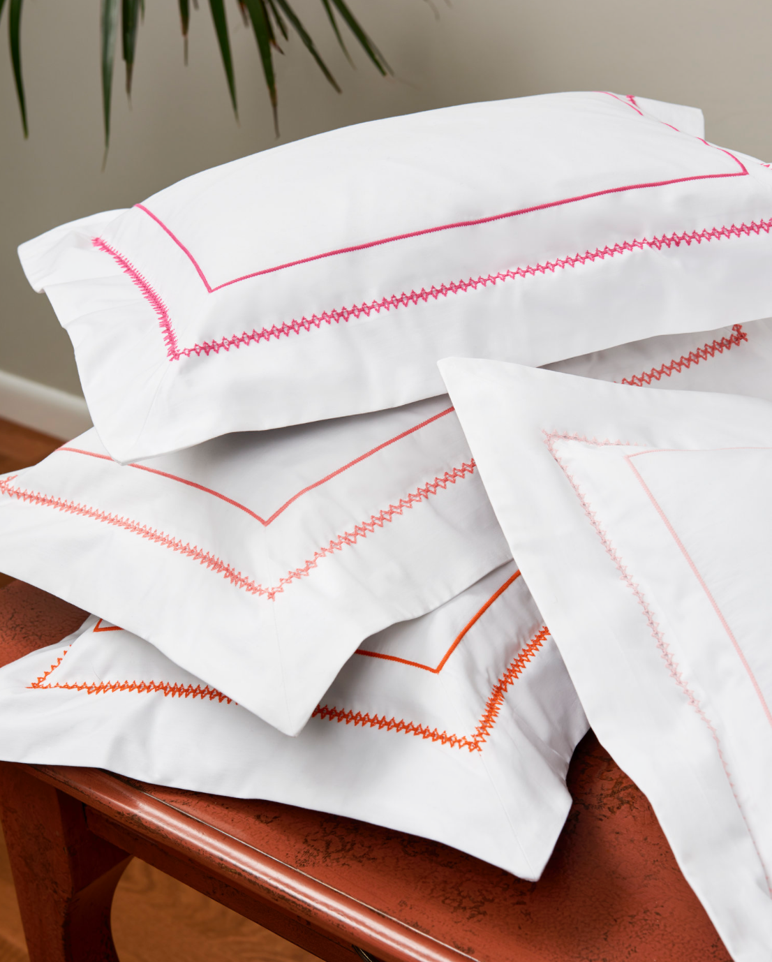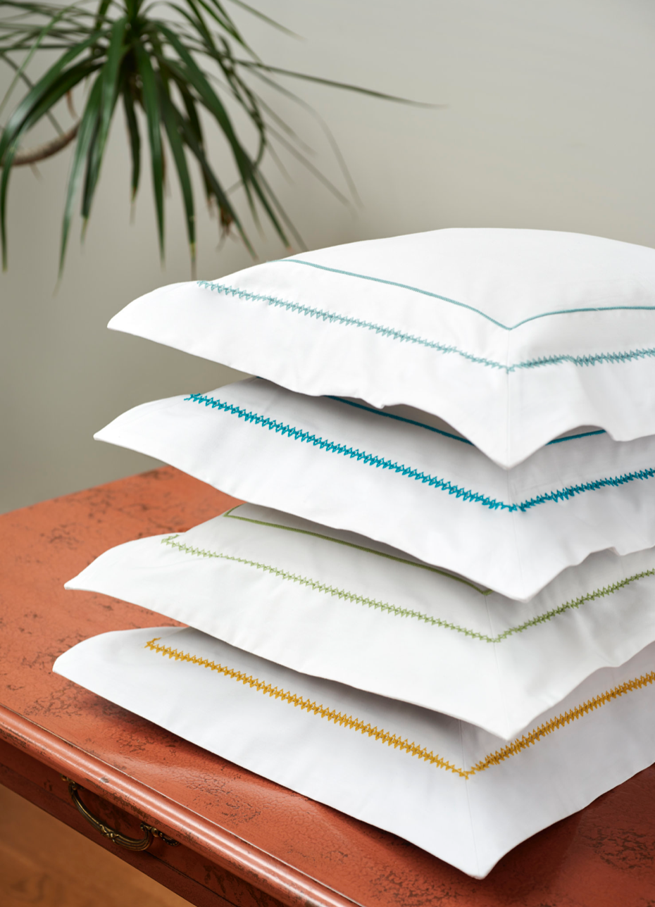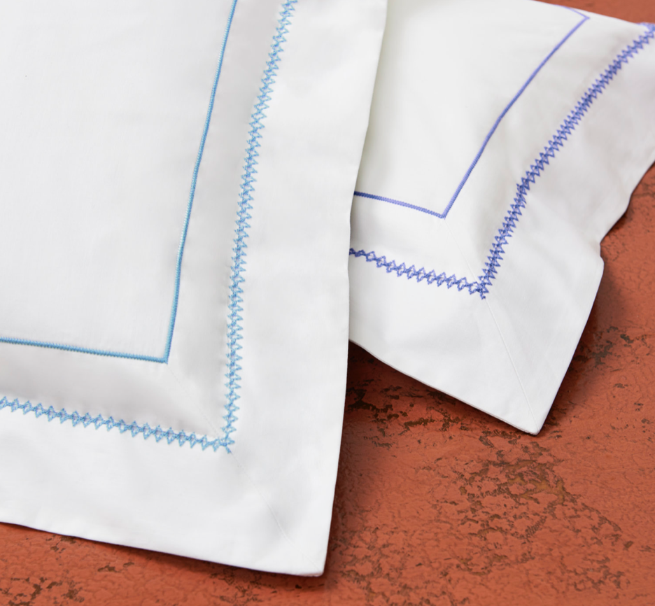 A unique embroidery resembling a delicate crochet stitch on white percale on sheets, pillowcases, duvets and shams.