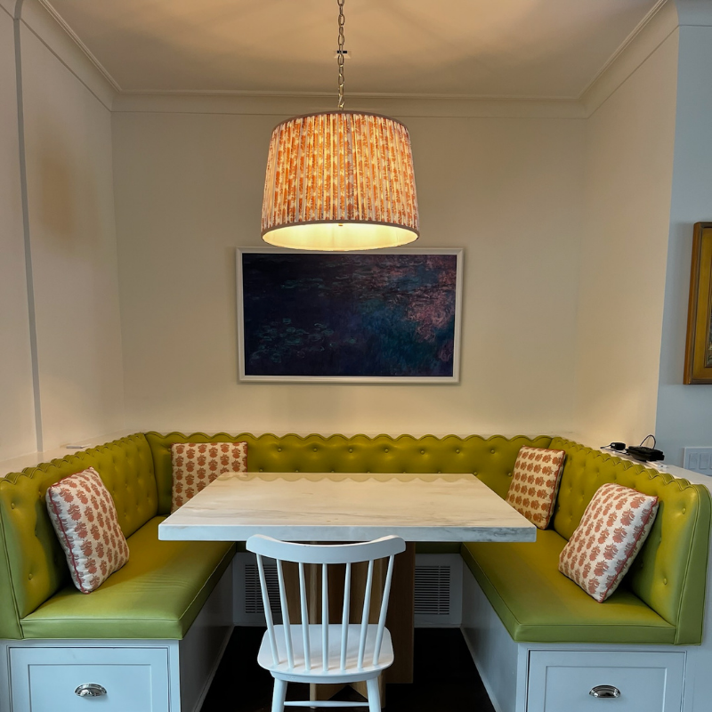This large lampshade pendant is custom made using Alex Conroy fabric, offering a beautifully textured look and soft, ambient glow. Finished with grosgrain trim, it features a tailored silhouette and timeless appeal. Perfect as a statement piece for dining rooms, living spaces, or bedrooms, it brings bespoke craftsmanship and understated elegance to any interior.