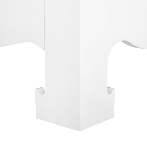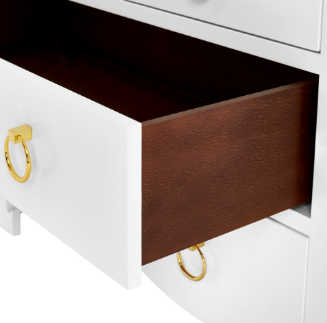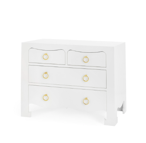 A modern embodiment of opulent Hollywood Regency design, our Jacqui Large 4-Drawer features decorative wood-cut detailing, Chow-style curved feet, and a bold set of drawers topped with glittering gold ring pulls.