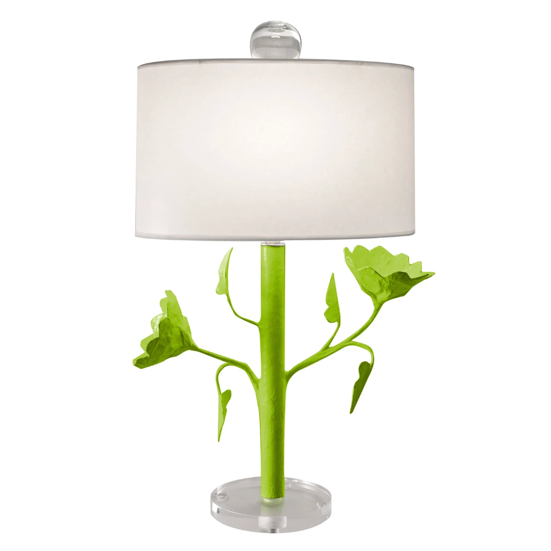 Pretty poppies bloom from the base of the Jarmin Table Lamp. Metal tubing is layered and adorned with papier mache to create this beauty and then painted to order with 2 coats of non toxic paint and a water based varnish. The oval paper shade is also hand crafted in our workshop and the ball finial is mouth blown recycled glass.