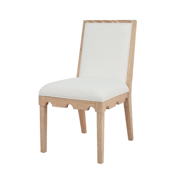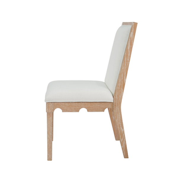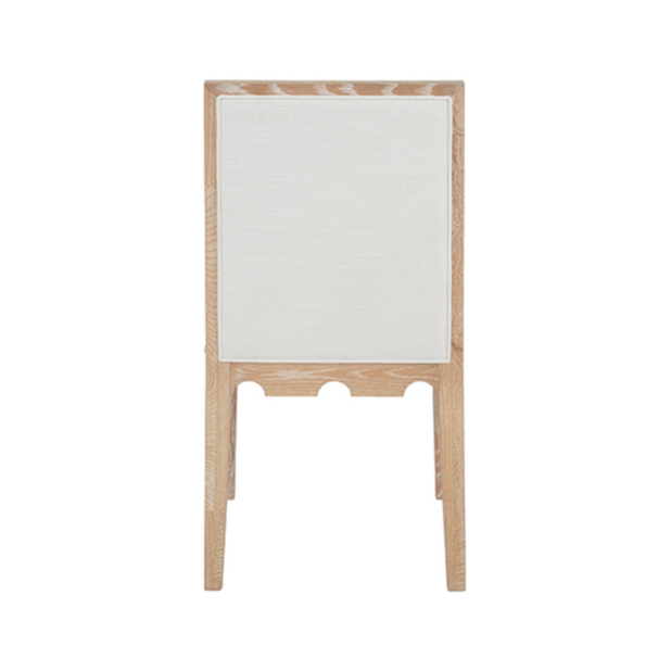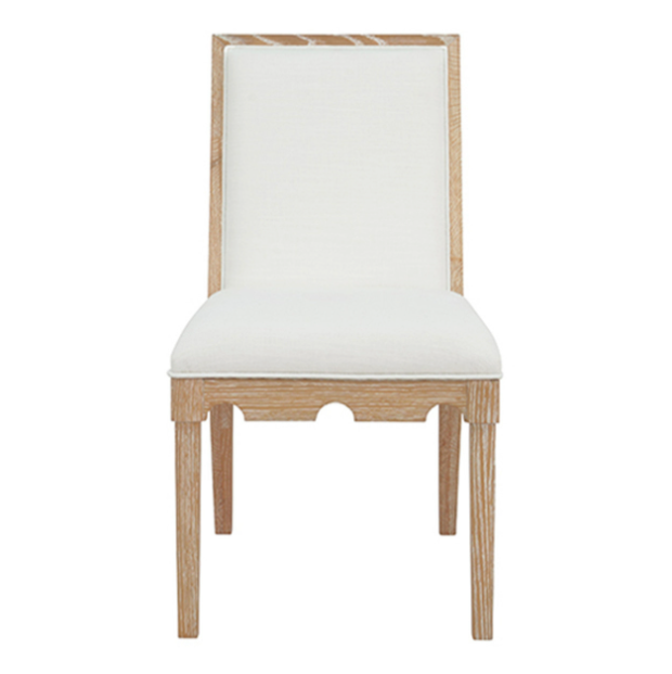 Square back dining chair with decorative apron in cerused oak with performance white linen upholstery