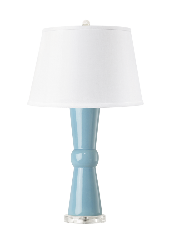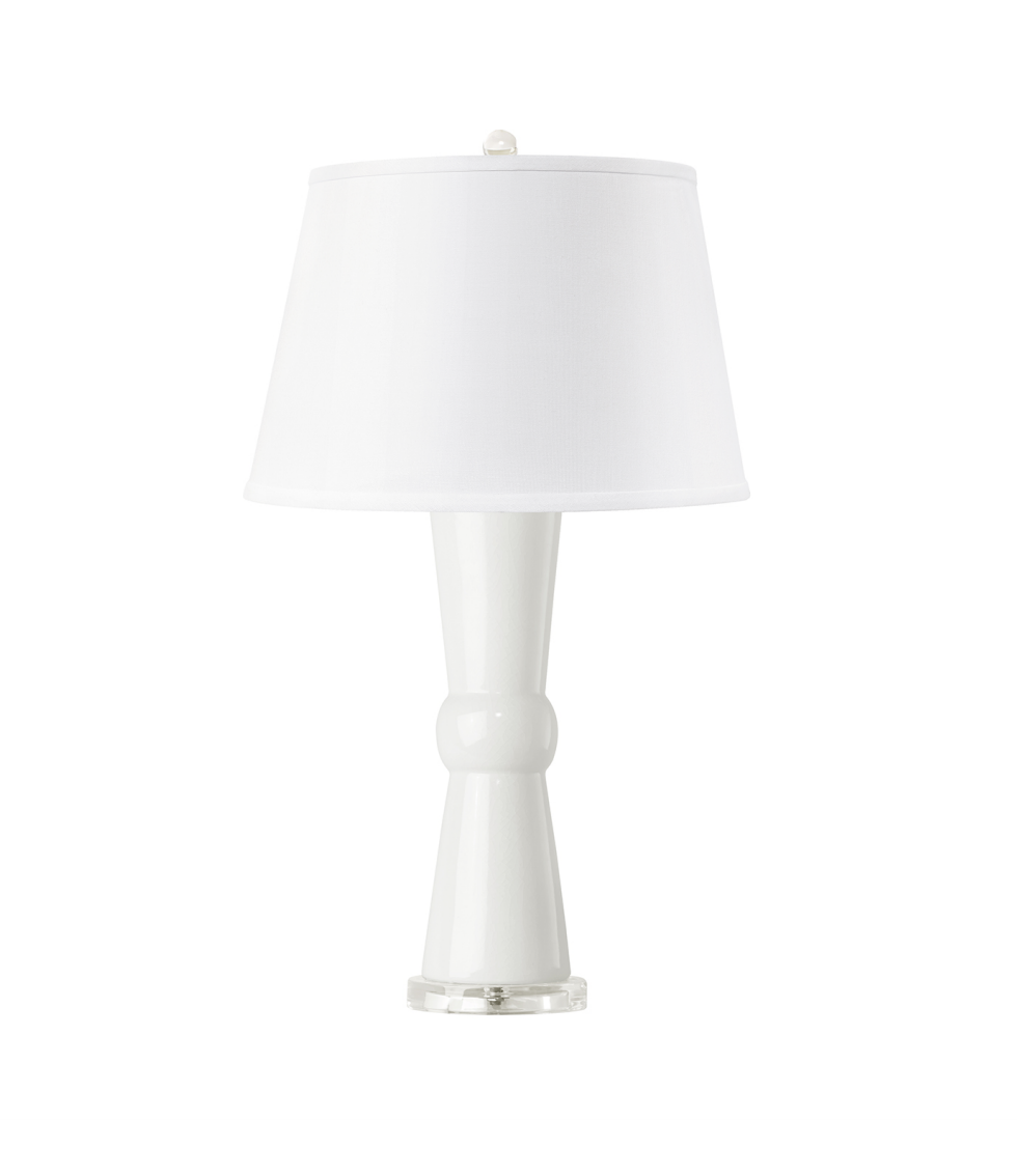 the Clarissa is rendered in durable American ceramic, crafted by our experienced artisans. Its blush pink finish has been given a medium-reflective glaze while its clear acrylic base adds an extra touch of shine. This lamp is topped with a crisp white laminated linen shade, accented with nickel hardware.