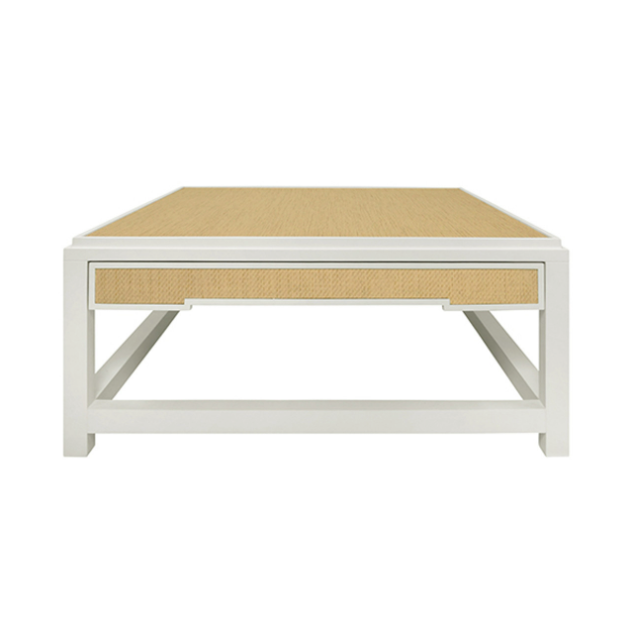 - Two hidden drawer coffee table with matte white lacquer frame and inset natural grasscloth