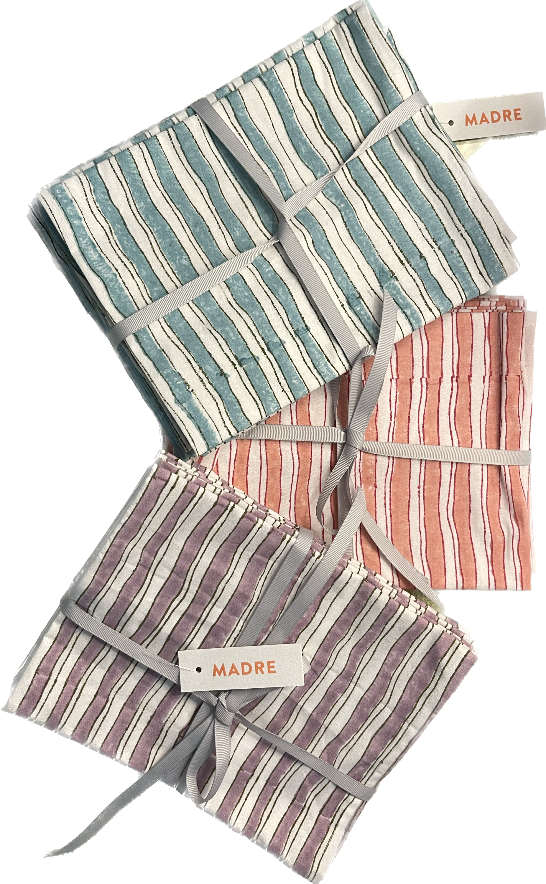 The Madre's collaborated with artisans in India to create custom color ways of their hand block printed designs. Pair these napkins with our coordinating table cloths for the perfect table scape.