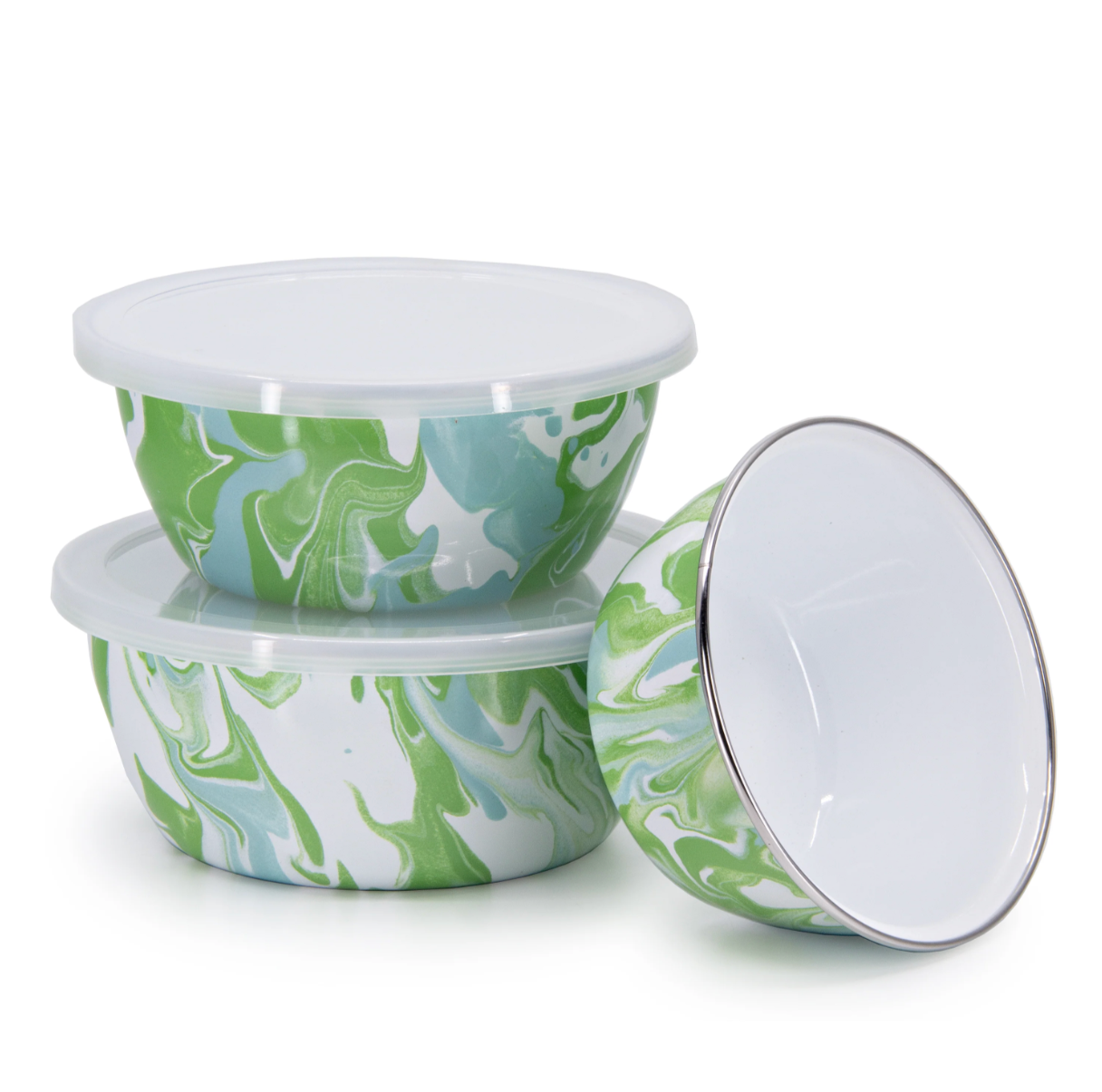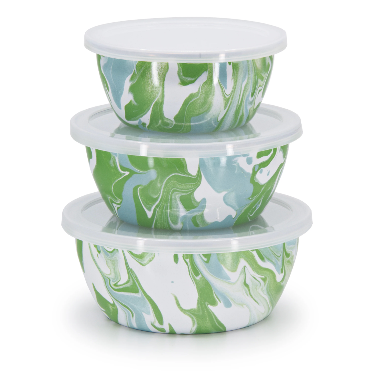 The gorgeous impressionistic swirl of blue and green on these dip bowls makes them the perfect addition to your kitchen or a spring table! The three different sizes nest inside of one another for storage.