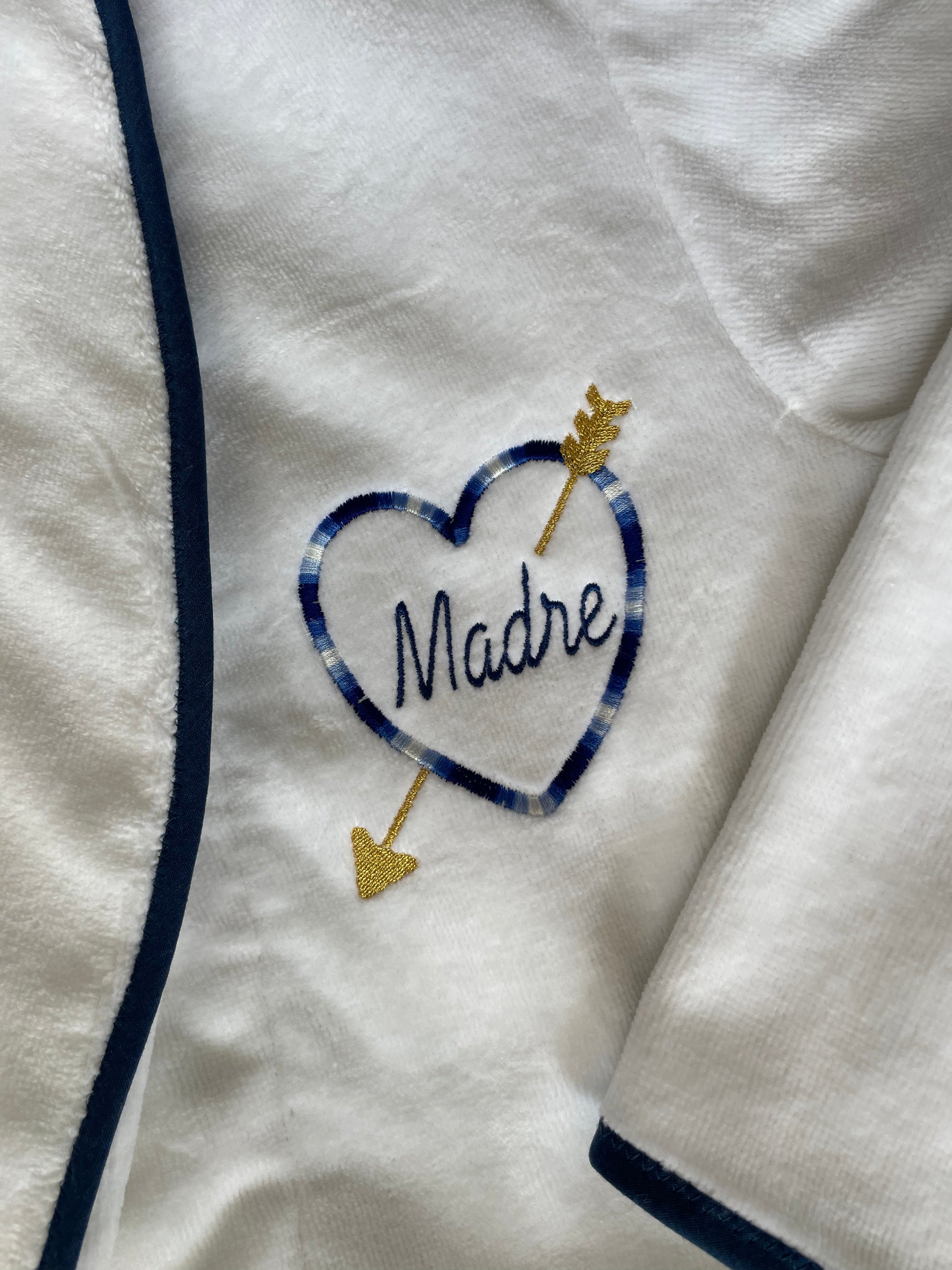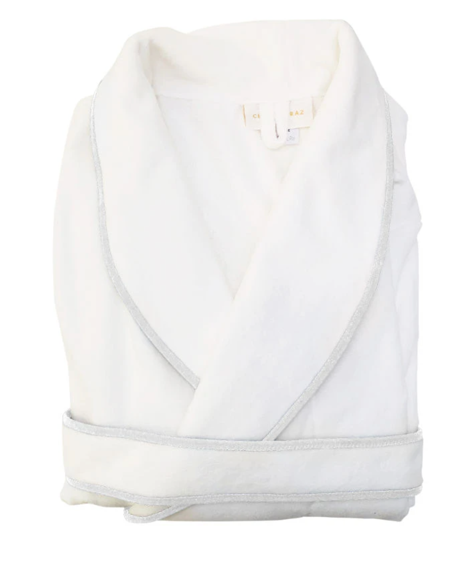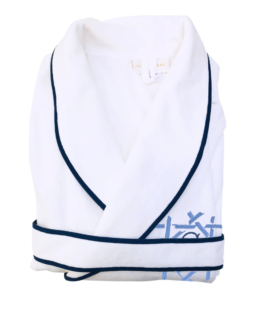 Cozy up in a Cece Dupraz signature robe. Made with plush velour terry on the outside, and the absorbent (towel) terry on the inside, edges trimmed in navy or white poplin. Choose your monogram design, and leave the stitching to us!