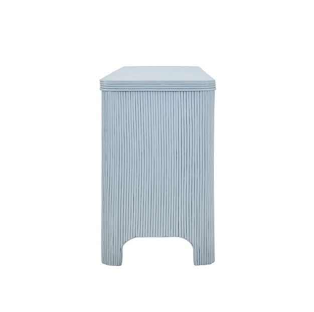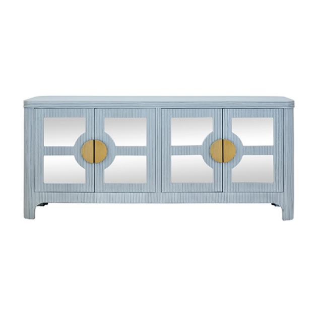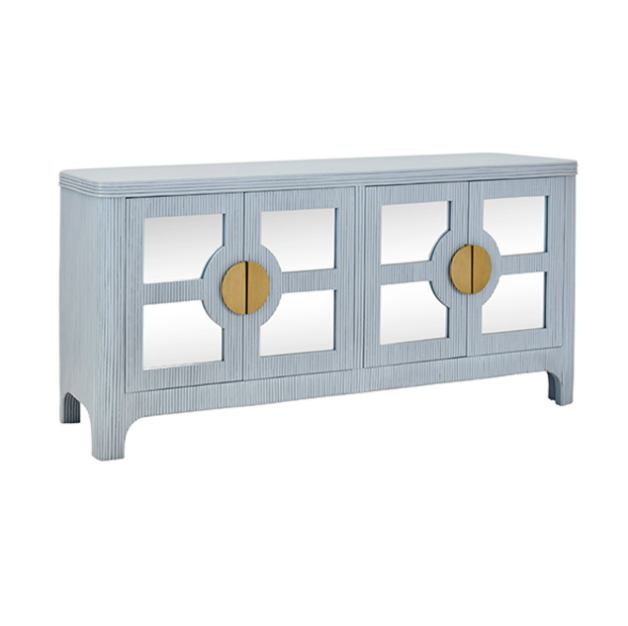 - Four door mirror front rattan reeded case buffet in painted light blue