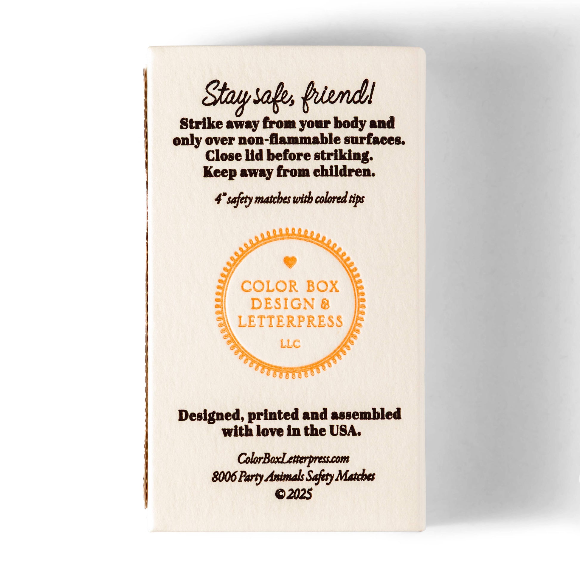 A zebra, a dalmatian, & a rooster walk into a party… & they’re all wearing hats. This matchbox brings the fun with a whimsical animal stack, complete with birthday flair. Use them to light candles, incense, or a cozy fire pit—and keep a few on hand for the perfect small gift.