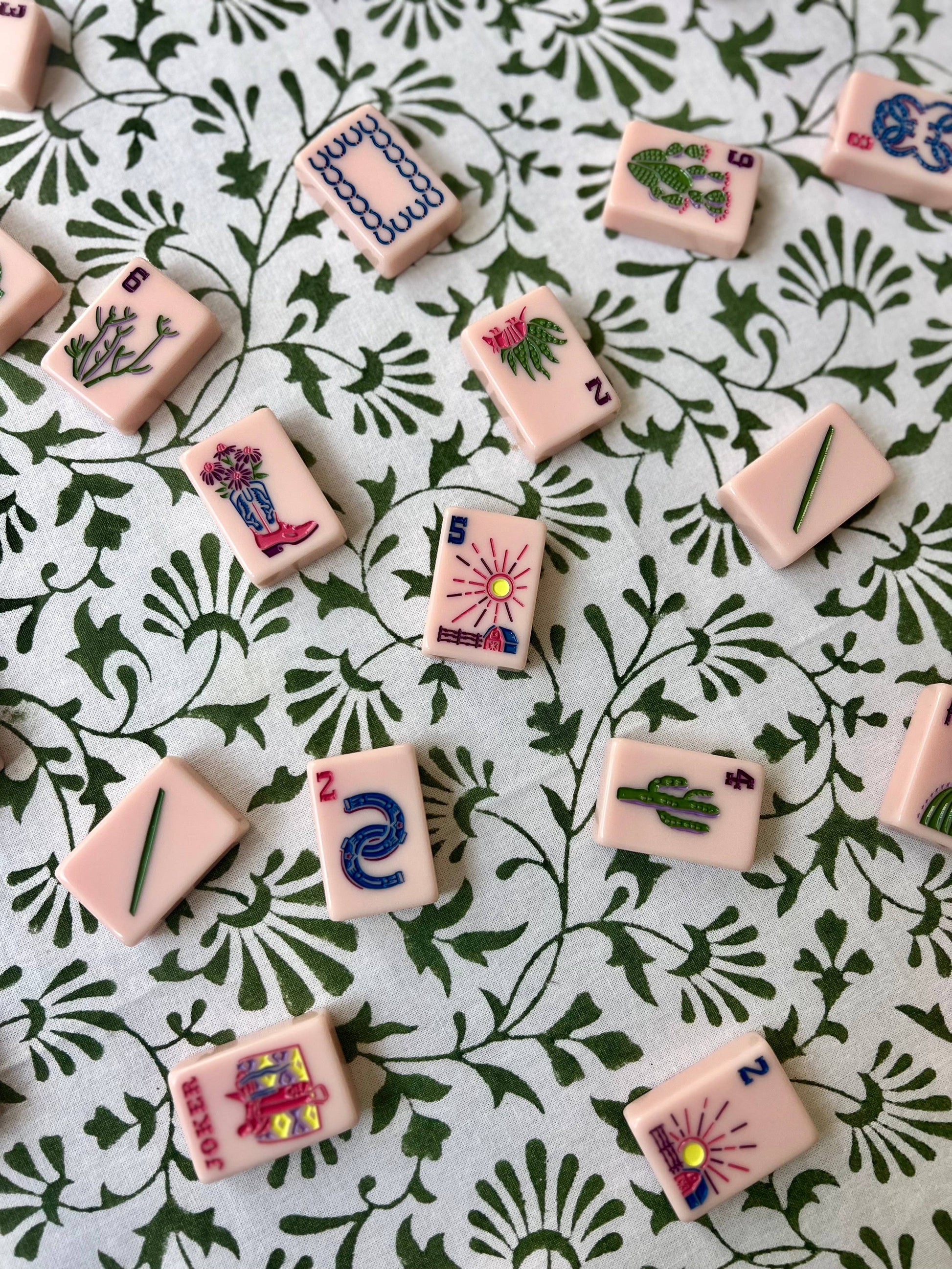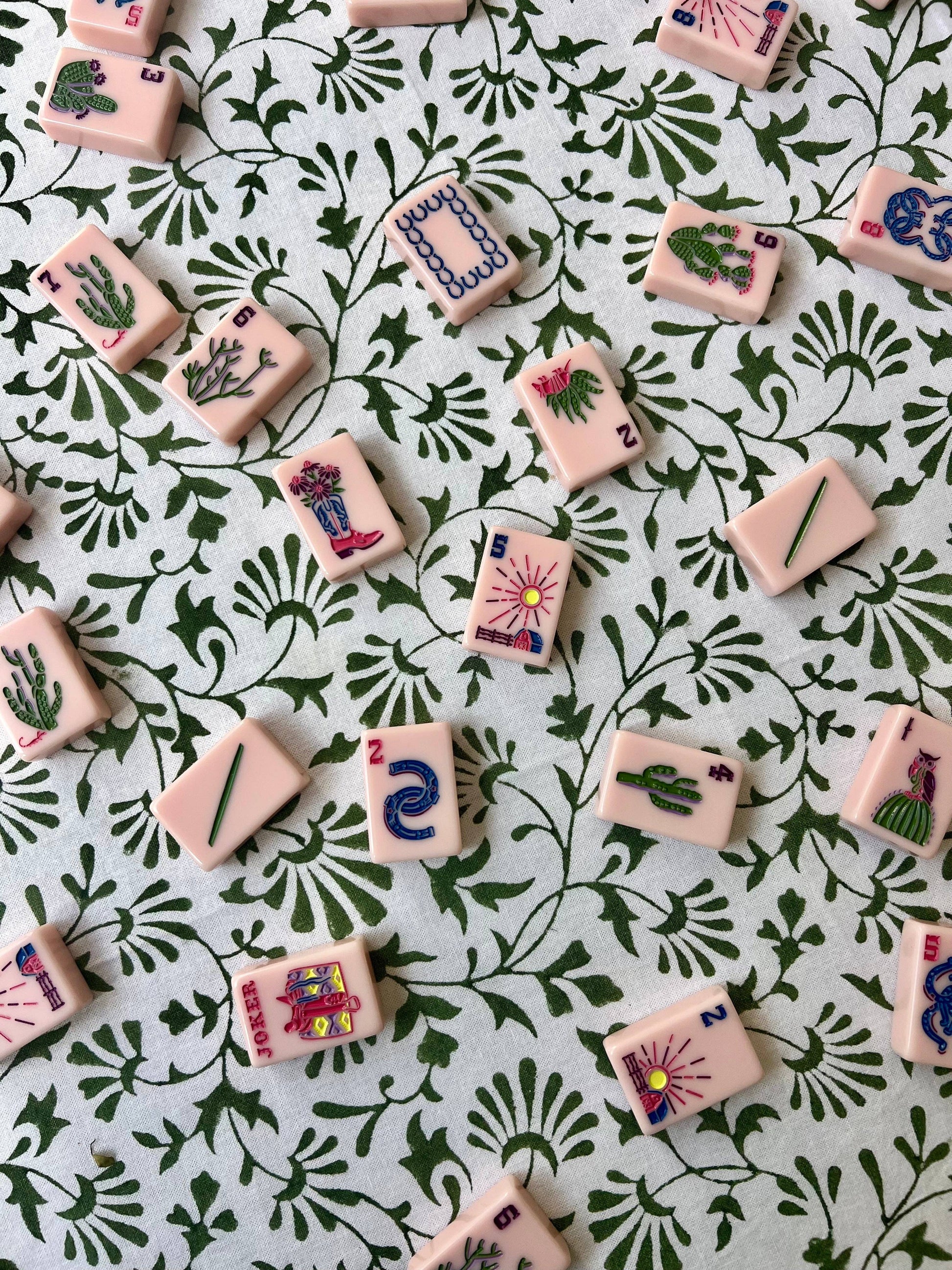 A beautiful piece for hosting your Mahj Squad, brunches, dinners, or everyday meals with elegance! This tablecloth features a trailing green florets design on soft cotton.