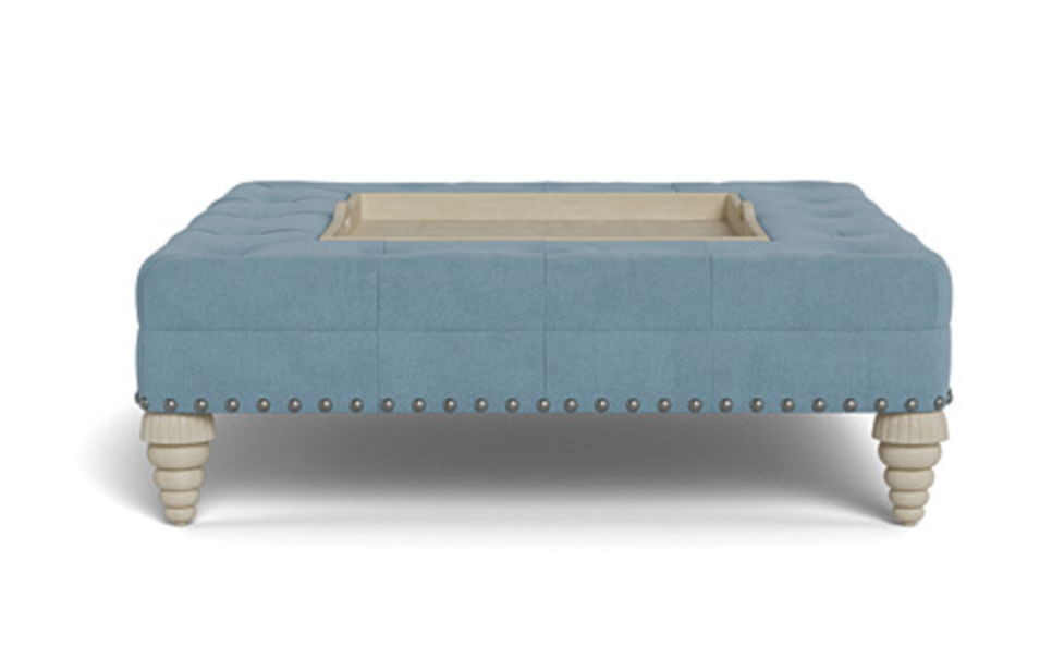 This Bunny Williams Home ottoman is truly a necessity when it comes to entertaining, this ottoman is made for living. Serve drinks and hors d’oeuvres on the sturdy and functional tray while creating an inviting center to your gatherings. Part coffee table, part footrest, this unbelievably versatile piece can also be used as occasional seating. Detailed with button-tufted upholstery, painstakingly hand-carved wood feet and a chic French nailhead trim.